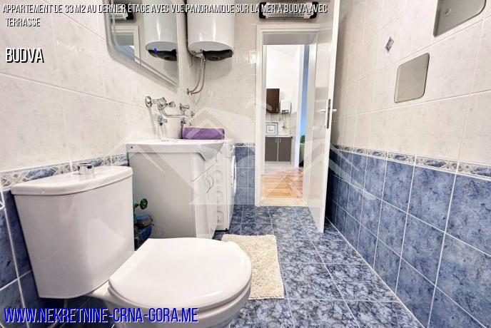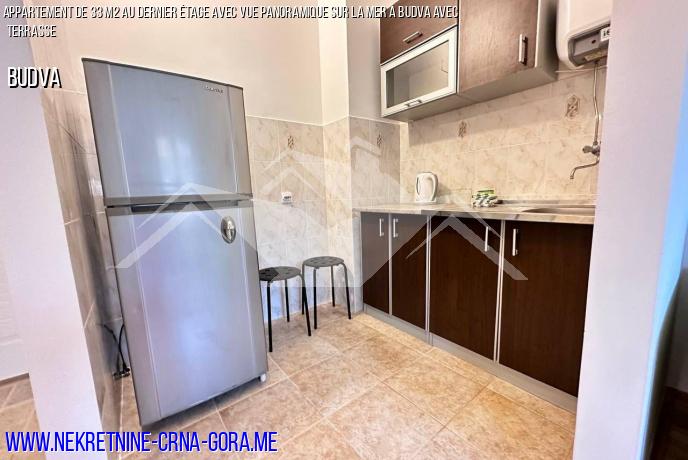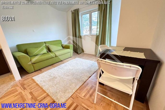 L'appartement se compose d'une chambre, d'un salon avec coin cuisine séparé, d'une salle de bain avec baignoire et d'une terrasse offrant une vue panoramique sur Budva et la mer.