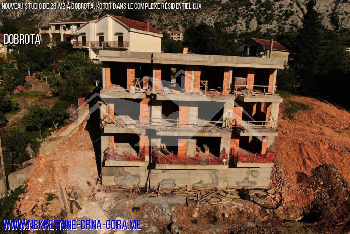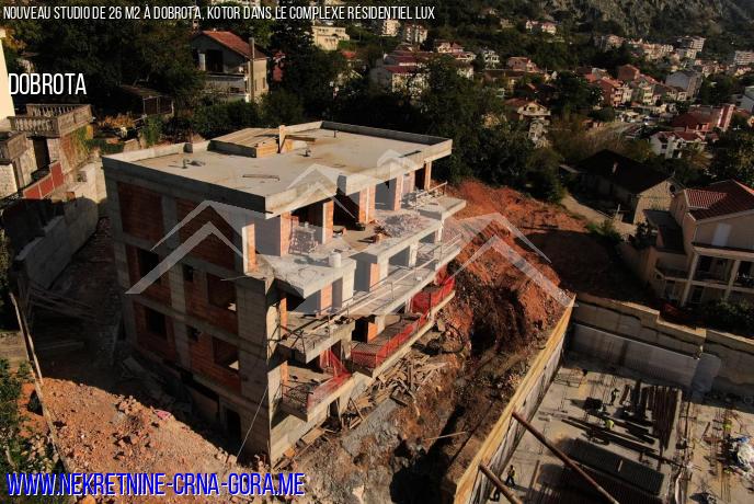 Complexe résidentiel en construction dans le quartier attrayant de Dobrota à Kotor, très proche de la mer. Il se compose de deux bâtiments, dont chacun a trois étages et est en phase de construction préliminaire.