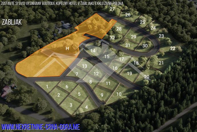 Urbanizovaný pozemok v Zabljaku s rozlohou 8 700 m2 m2 v Elitnej dedine Chaledorf je na predaj s povolením na výstavbu veľkého turistického zariadenia - butikového hotela (30-50 izieb) s dôrazom na priestrannosť, ticho a panoramatický výhľad. Reštaurácia. Kúpeľný komplex. Wellness centrum.