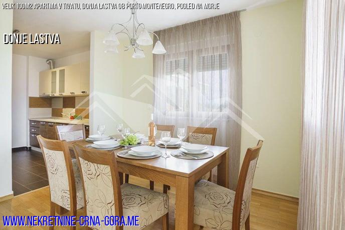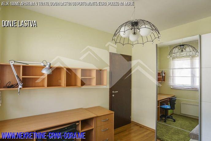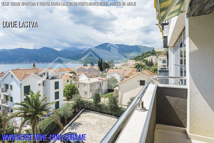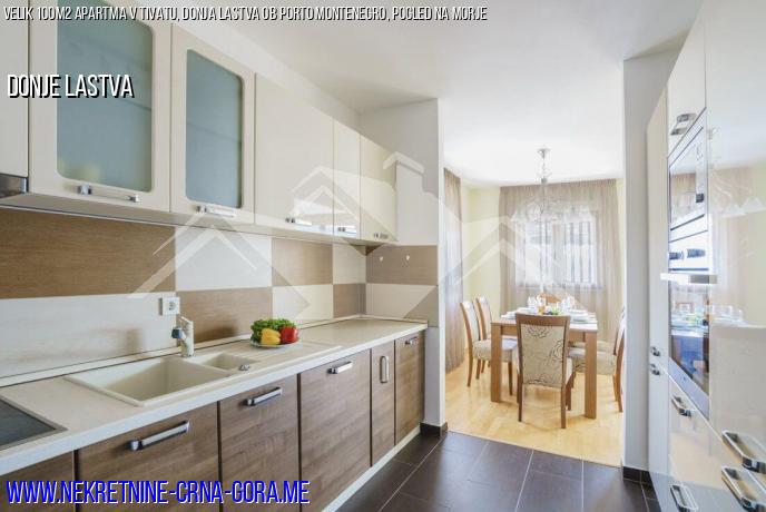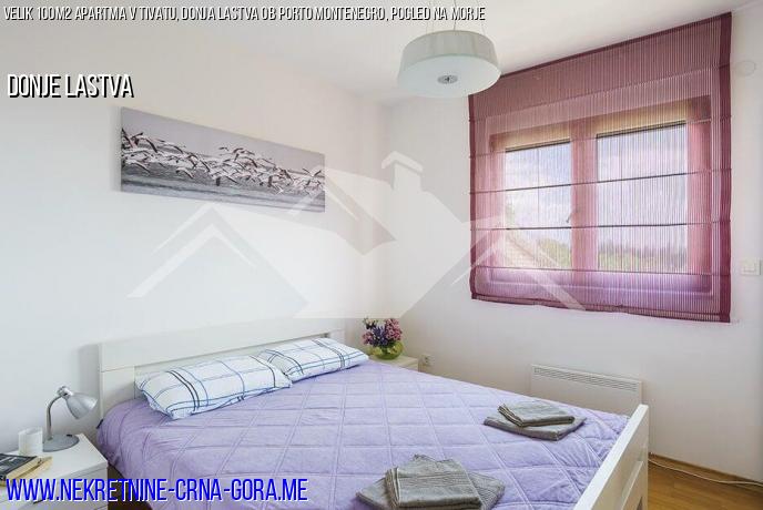 Apartma velikosti 100 m2 se nahaja na prestižnem območju Tivat – Donja Lastva, Sestavljen je iz treh spalnic, dnevne sobe, kuhinje, dveh kopalnic in dveh teras s pogledom na morje, shrambe in parkirnega prostora.