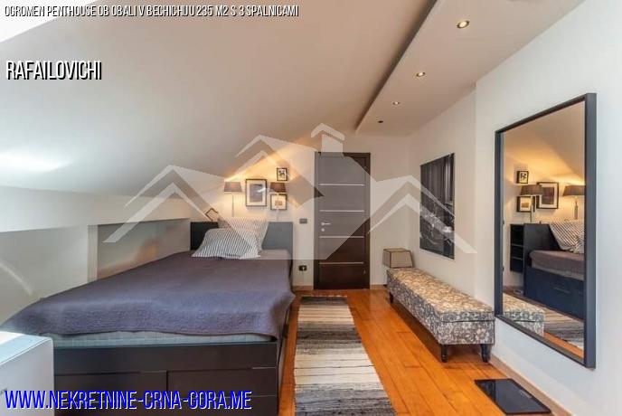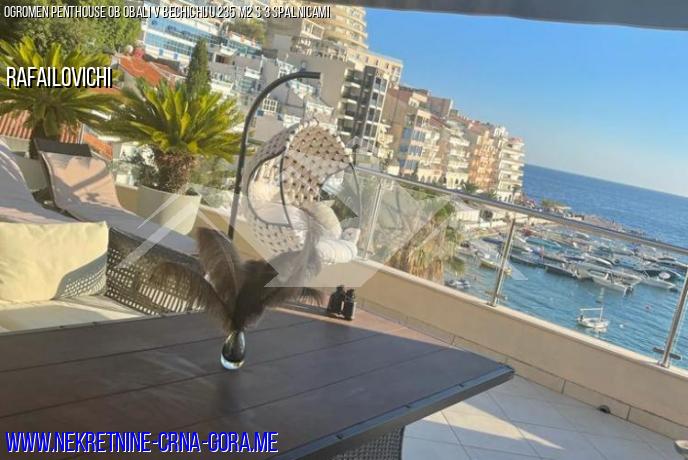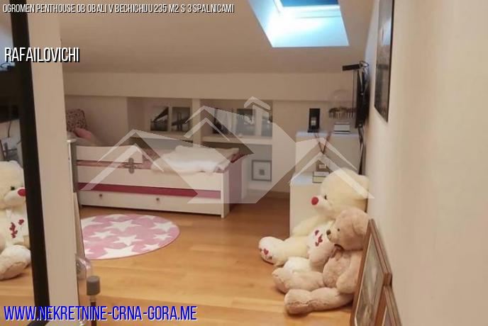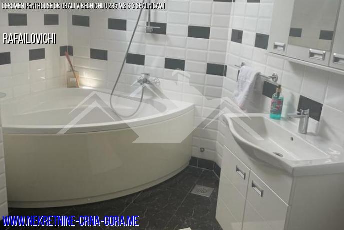 Penthouse s površino 235 kvadratnih metrov z udobno teraso in čudovitim razgledom. Prva linija do morja, 4 nadstropja. Velika kuhinja in dnevna soba, velik hodnik po celotni dolžini stanovanja, pralnica, kopalnica s tušem. Iz ene sobe je izhod v kopalnico z veliko kadjo, druga kopalnica pa je ločena in ima tuš kabino.