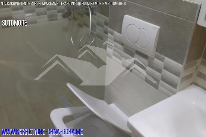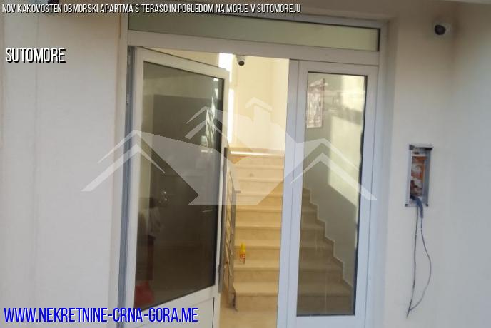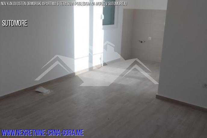 Velika terasa 12 m2, stranski pogled na morje, spalnica, dnevna soba s kuhinjo, hodnik.