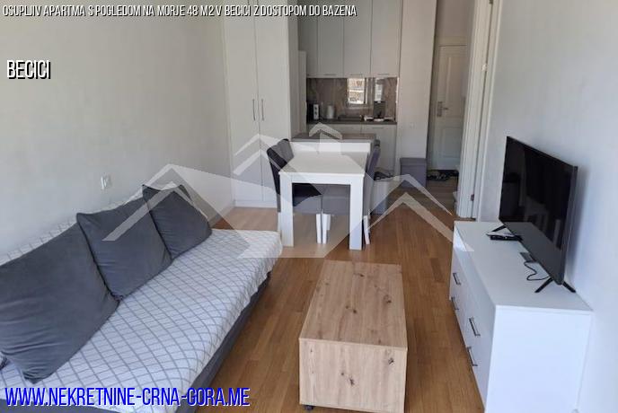 Enosobno stanovanje s pogledom na morje in bazen v Becici. Površina stanovanja je 48 kvadratnih metrov, nahaja se v 8.nadstropju. Prostorna terasa, odličen pogled na morje in gore. Opremljen je z vsem potrebnim. Med razpoložljivo opremo: pralni stroj, pomivalni stroj, hladilnik, električni štedilnik, kuhalnik vode, Sesalnik, TV (smart), dve klimatski napravi.