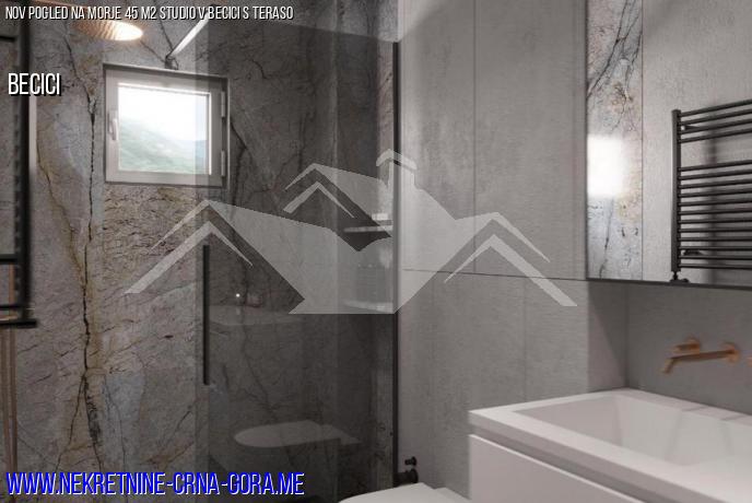 Studio apartma v novi stavbi, s pripravljenim oblikovalskim projektom, ki se nahaja v mirnem stanovanjskem območju Becici. Apartma se nahaja 600 metrov od morja.