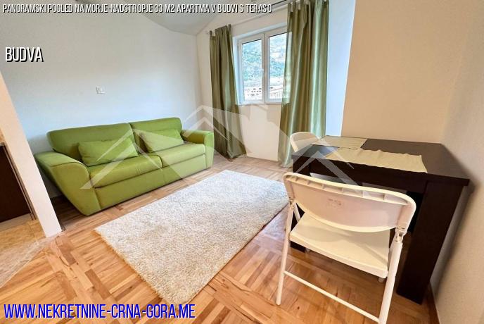 Apartma je sestavljen iz spalnice, dnevne sobe z ločeno kuhinjo, kopalnice s kadjo in terase s panoramskim pogledom na Budvo in morje.