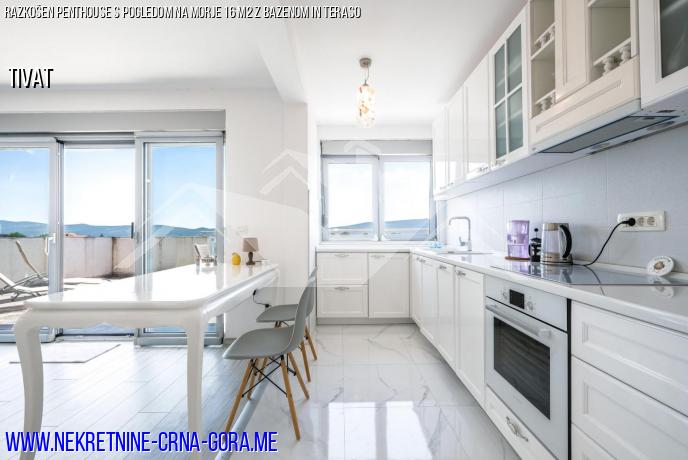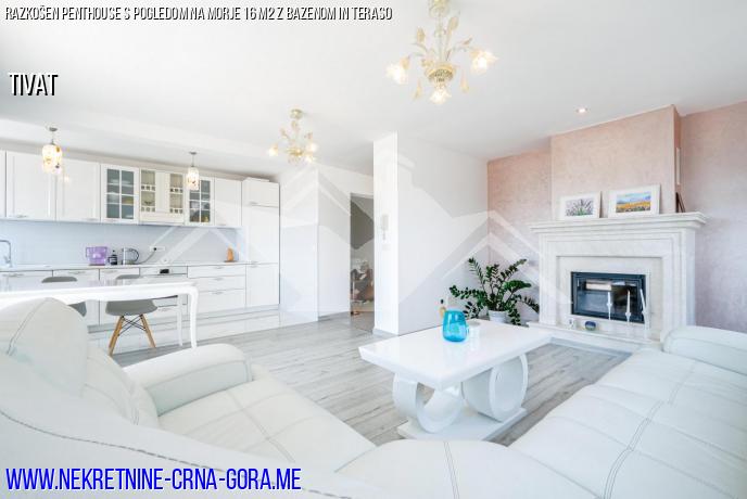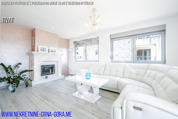 Penthouse je sestavljen iz prostorne dnevne sobe s čudovitim kaminom in kuhinje z jedilnico, 3 spalnic, 2 kopalnic, 1 shrambe in velike terase s panoramskim pogledom na mesto in morje. Dnevna soba je opremljena z italijanskim pohištvom in lestenci iz italijanskega in muranskega stekla. To je edino stanovanje v pritličju, zato lahko po želji uporabite tudi podest in ga ogradite.