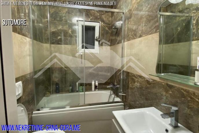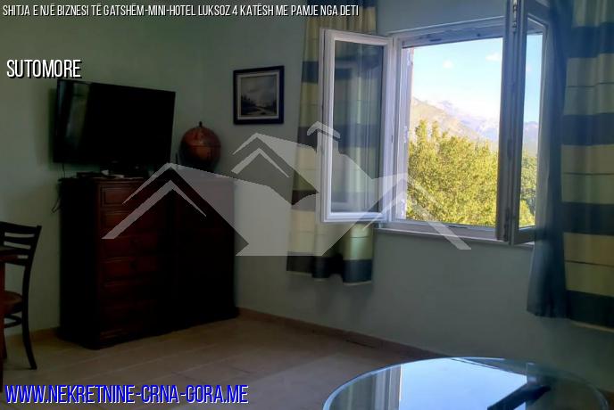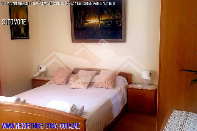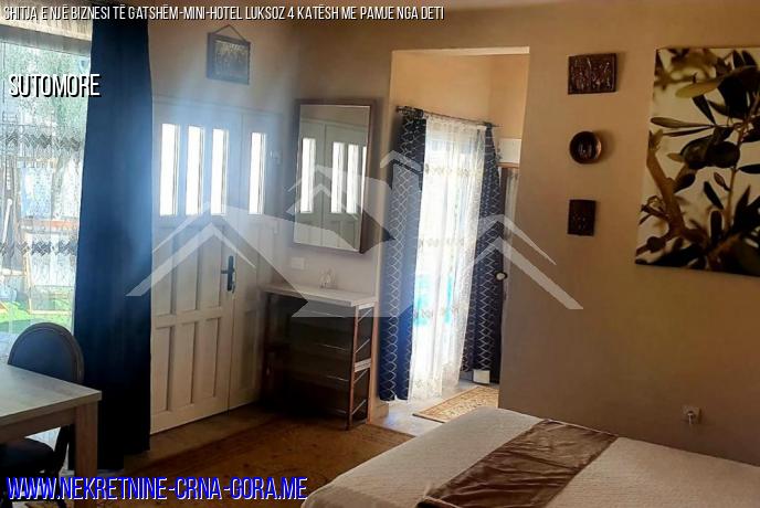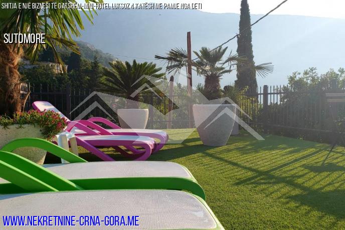 Shitet një mini-hotel funksional për 4 apartamente me pishinë, sauna, Parkim Për 6 makina në një vend komod, privat në Sutomore (Zagraj) me pamje nga deti dhe malet si një biznes operativ i gatshëm. Shtëpia është e legalizuar.