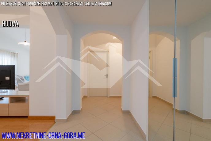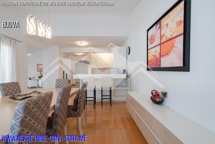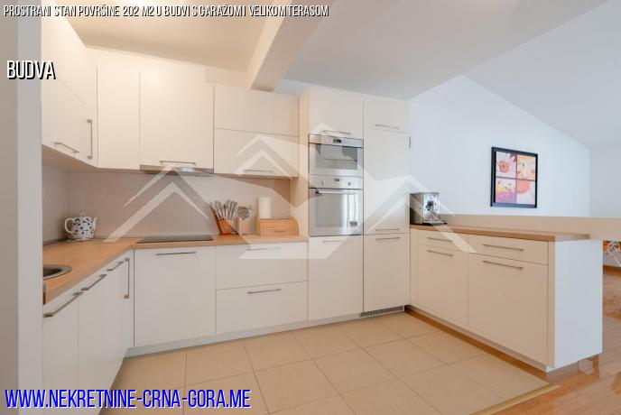 Apartman ima 3 spavaće sobe s bračnim krevetima, 2 kombinirane kupaonice s tuševima, gostinjsku sobu (kauč na rasklapanje), potpuno opremljenu kuhinju, blagovaonicu, prostrani dnevni boravak, toalet za goste, ogromnu terasu s vanjskim namještajem, balkon s 2 spavaće sobe, pogled na planine, grad i more.