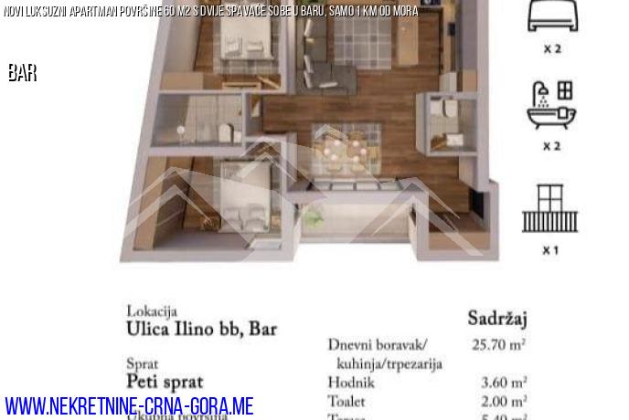 Prodaje se novi stan sa završnom obradom u novoj kući u baru udaljenom 1 km od mora.