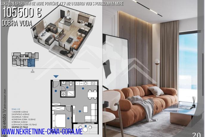 U šarmantnom odmaralištu Dobra Voda na prodaju su apartmani ukupne površine 47,7 četvornih metara, od čega 42,5 m2 zauzima stambeni prostor. Smješten na drugoj razini sedmerokatnice, ovaj je apartman dio stambenog kompleksa koji nudi sadržaje poput bazena od 15 metara sa 5 metara, žičare, centralizirane opskrbe vodom i parkirališta za automobile.